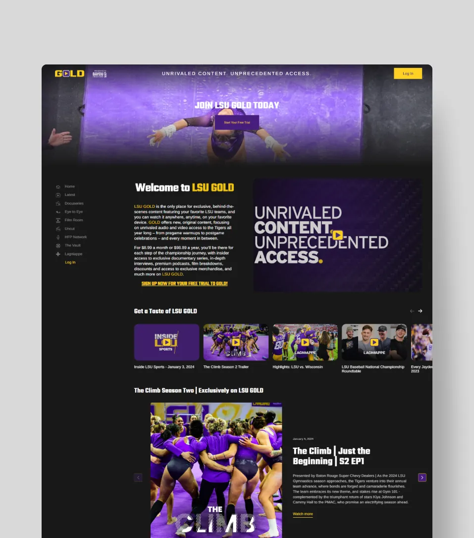LSU Gold's intention is to build a fan affinity membership community – this is more than a video subscription. Our partnership buildout includes the opportunity to create exclusive benefits like: ecommerce discounts, a second screen experience with interactive elements, access perks, VIP events and experiential opportunities.