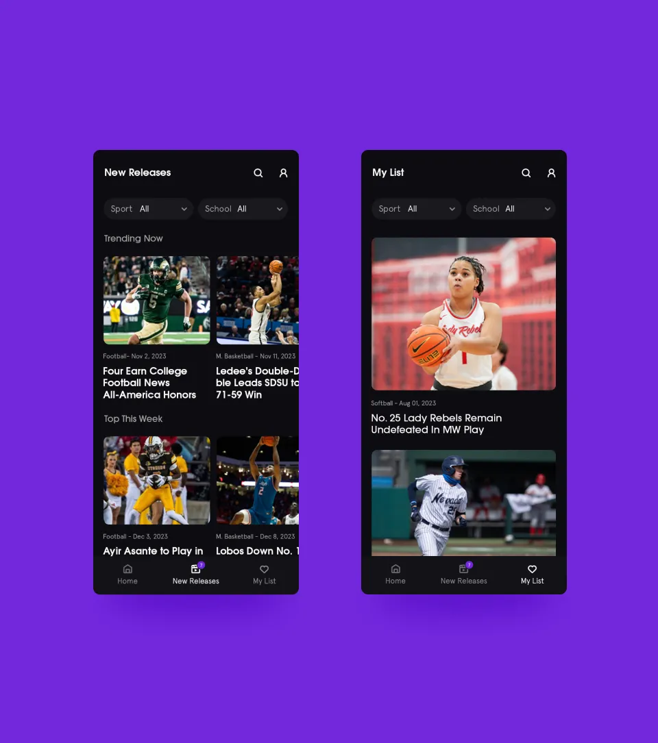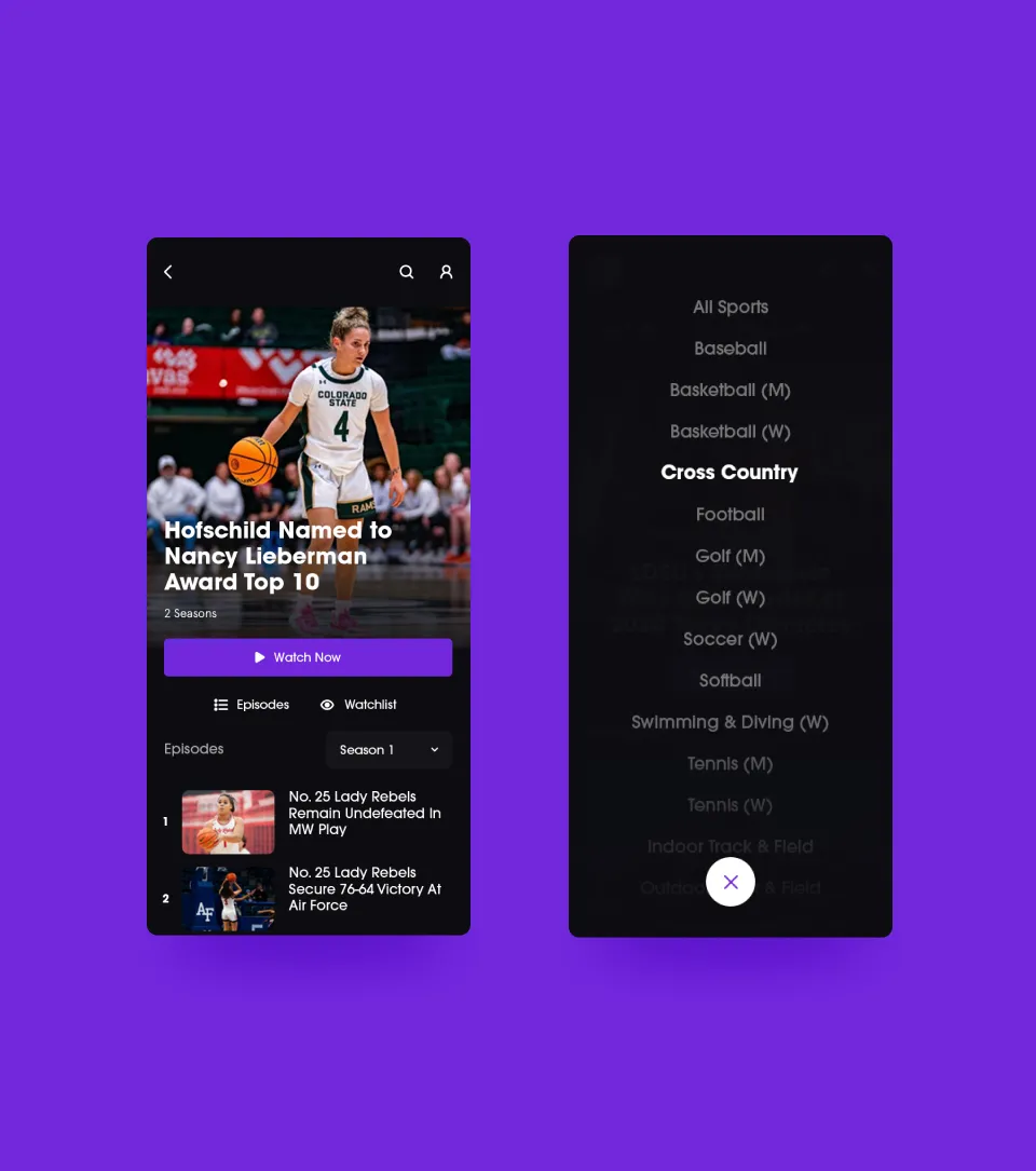 The Mountain West design had to account for one website, two mobile apps (Android & iOS) and four smart TV platforms (Apple, Android, Amazon Fire & Roku). The intentional use of black backgrounds behind all video content and lighter colors for text content is subtle cue to user expectations from the streaming giants.